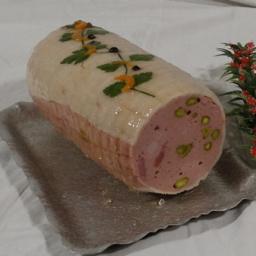Ballotine aux pistaches, maigre et gras de porc, oeufs, lait, cognac, pistaches, sel, poivre, épices
