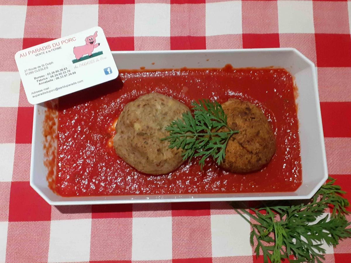 2 pièces de 100g. Boulettes de viande cuite, maigre et gras de porc, pomme de terre, oeuf, lait, oignon, sel, poivre, épices. A consommer dans les 8 jours après fabrication.