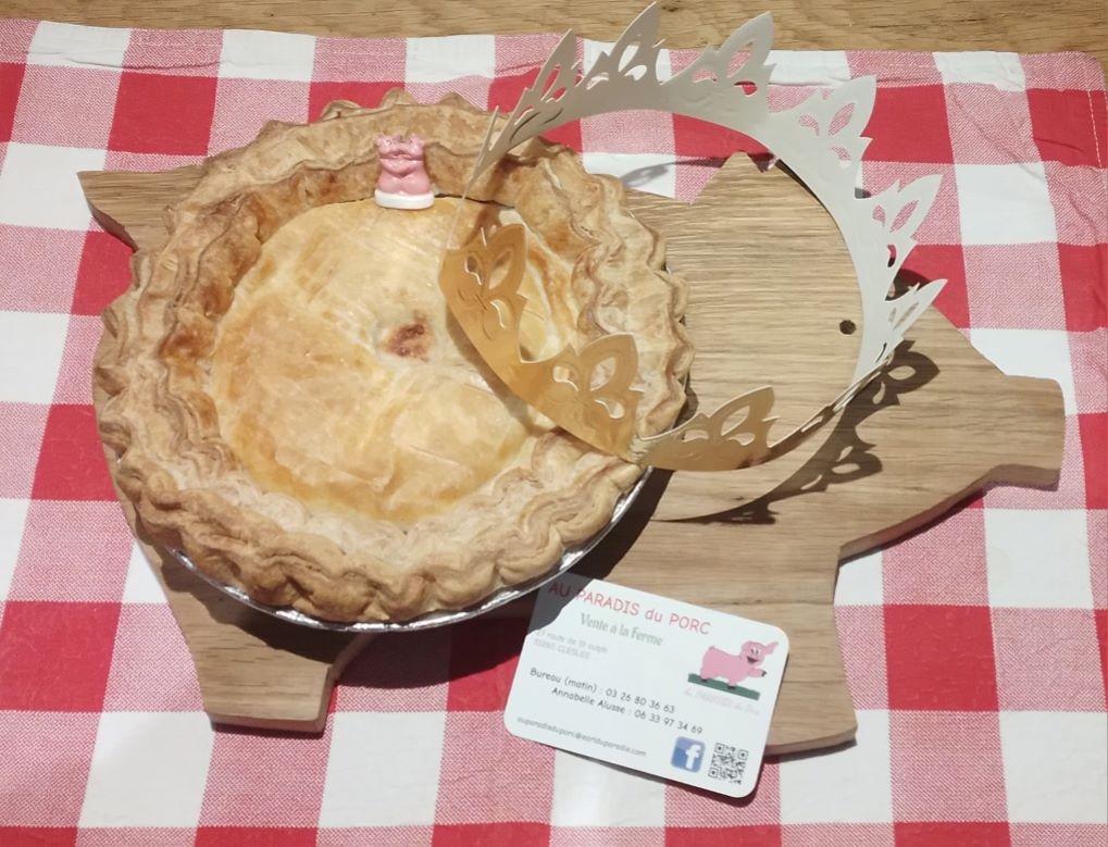 Pate feuilletée pur beurre faite maison, jambon, crème fraiche, emmental, sel, poivre, fève cochonne et couronne. Déjà cuite, elle est juste à faire réchauffer 15-20 min, à 80-90 °C au four